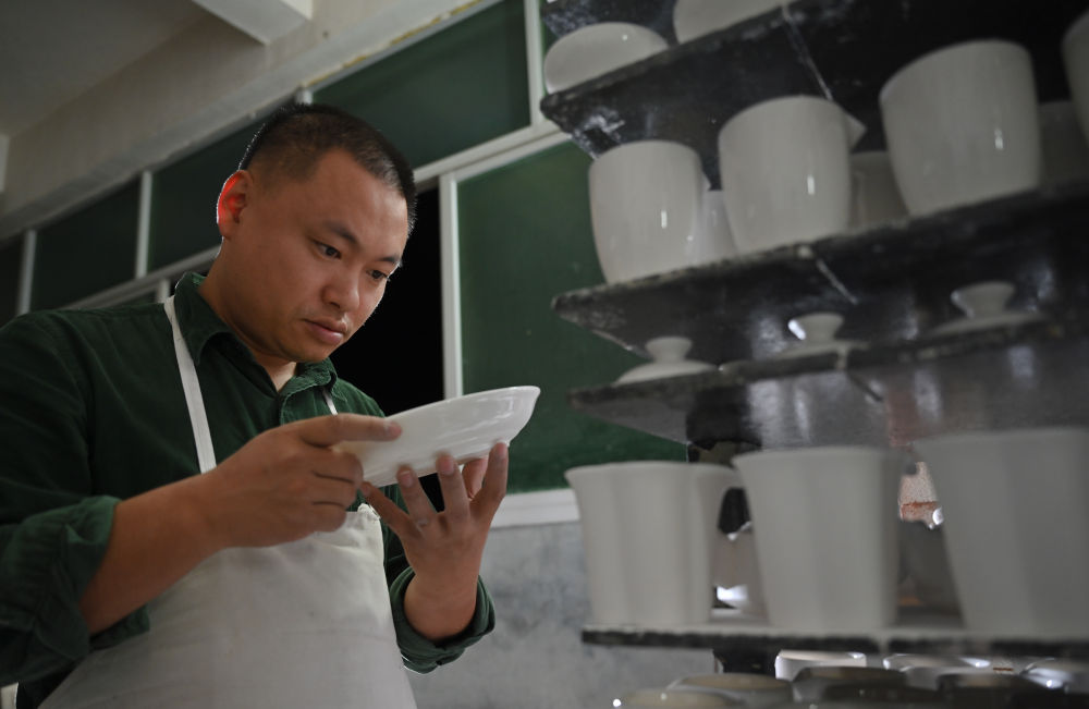 10月20日,徐金寶查看剛剛出窯的白瓷餐具。