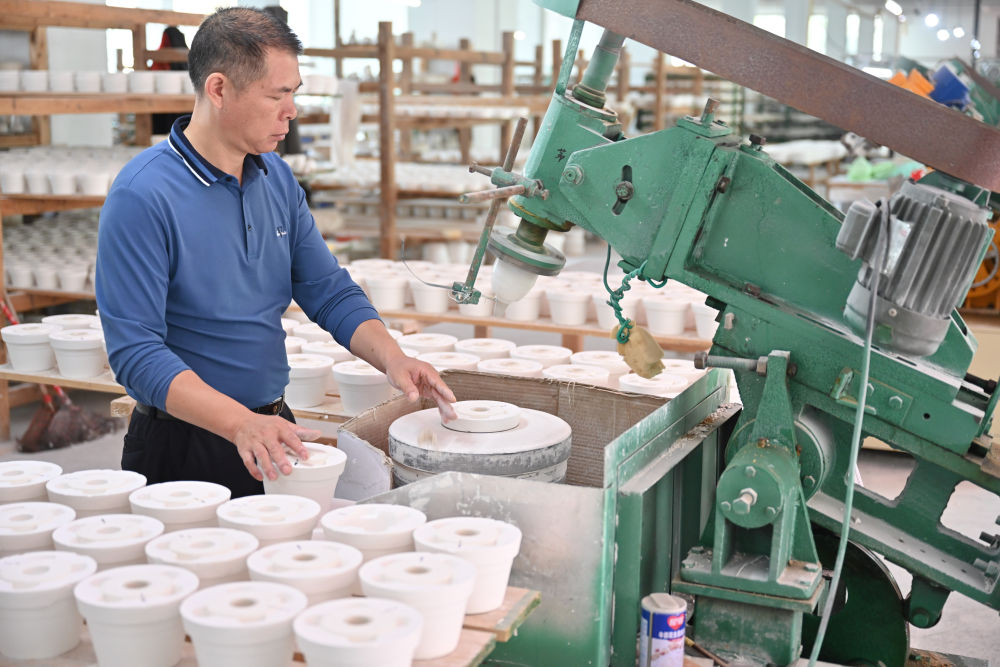 10月21日,在福建省泉州市德化縣順美陶瓷廠,工人操作機器制作陶瓷產(chǎn)品。