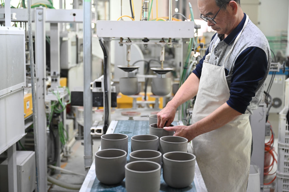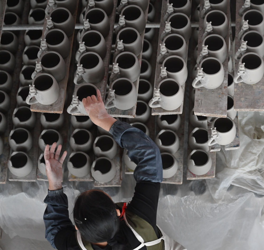 10月21日,在福建省泉州市德化縣順美陶瓷廠,工人擺放馬克杯以便烘干。