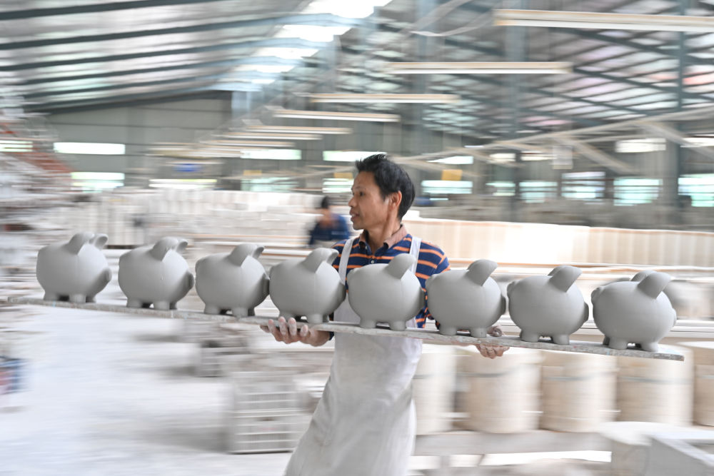10月21日,在福建省泉州市德化縣順美陶瓷廠,工人擺放一批陶瓷存錢罐。