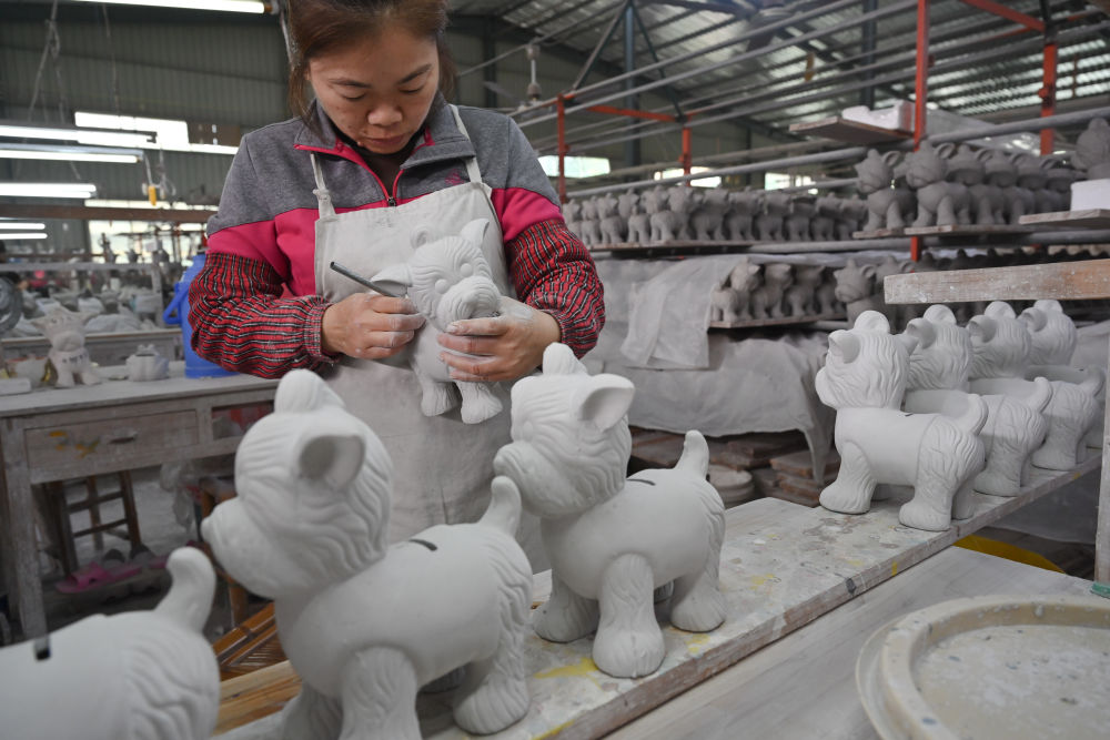 10月21日,在福建省泉州市德化縣順美陶瓷廠,工人制作出口歐美的陶瓷存錢罐。