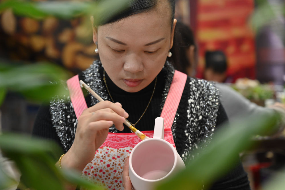 10月21日,在福建省泉州市德化縣順美陶瓷廠,工匠為出口的馬克杯上色。