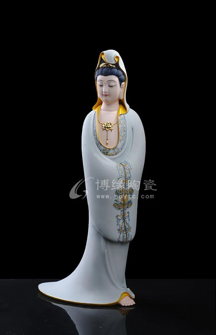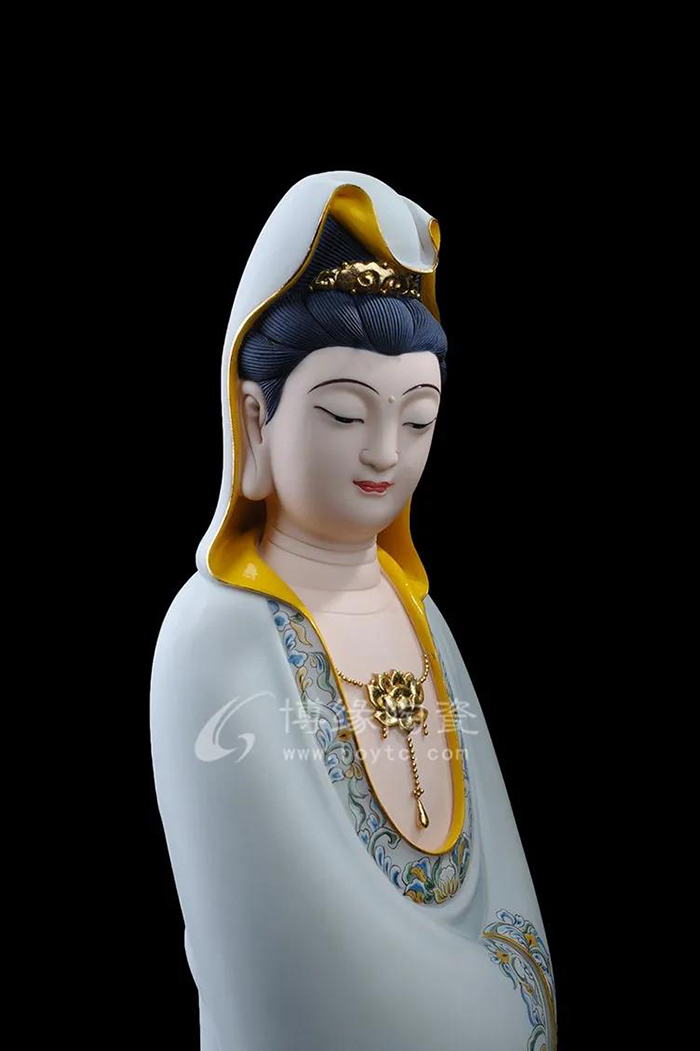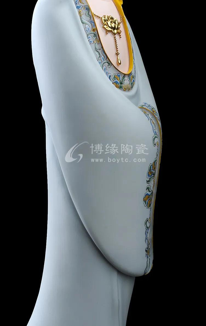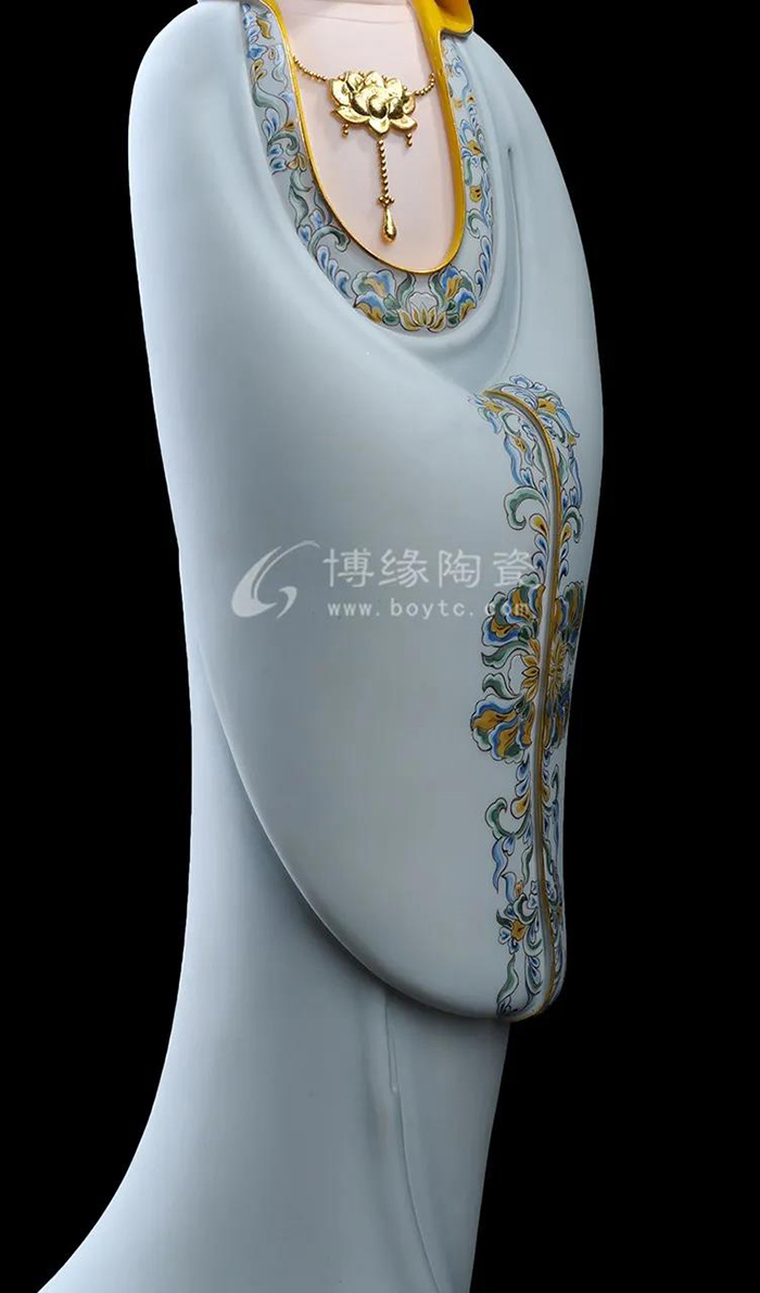 線條清晰、簡潔、瀟灑,多變化,柔媚流暢,翻轉(zhuǎn)自然,觀音雙手藏袖,神情嫻雅平靜,安詳自若,雙目低垂凝思。整座塑像精巧細(xì)致,神態(tài)如生。