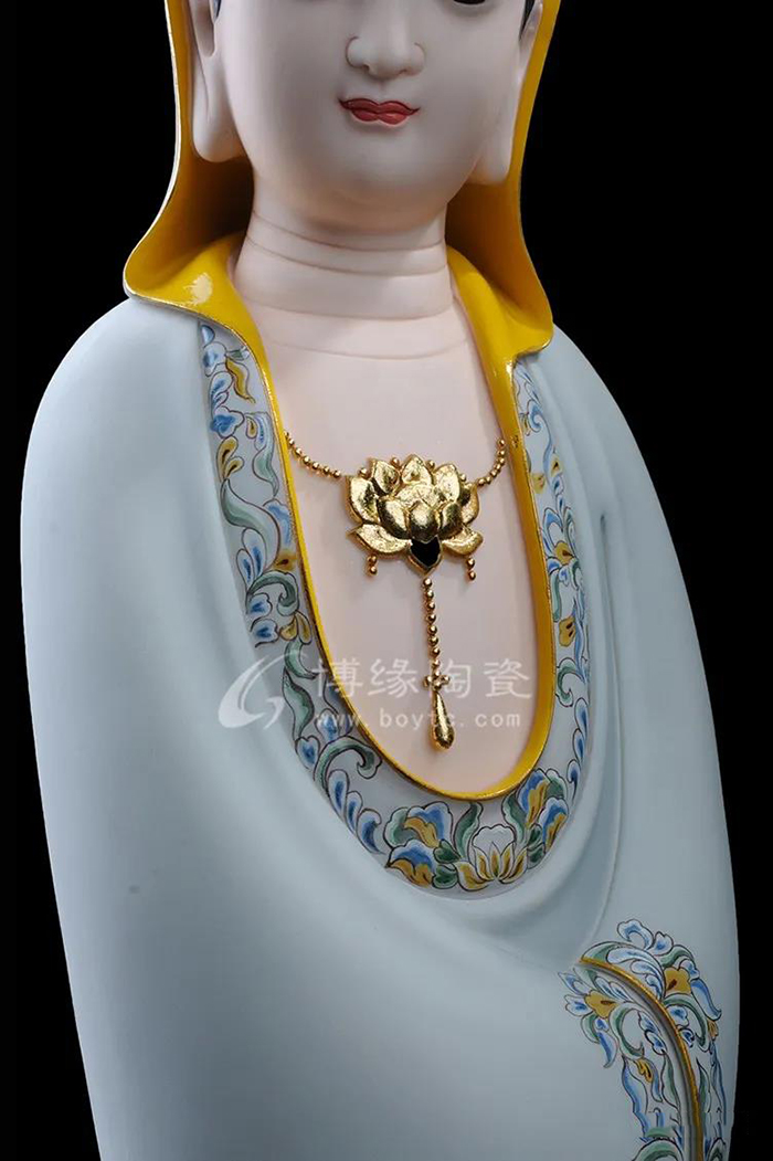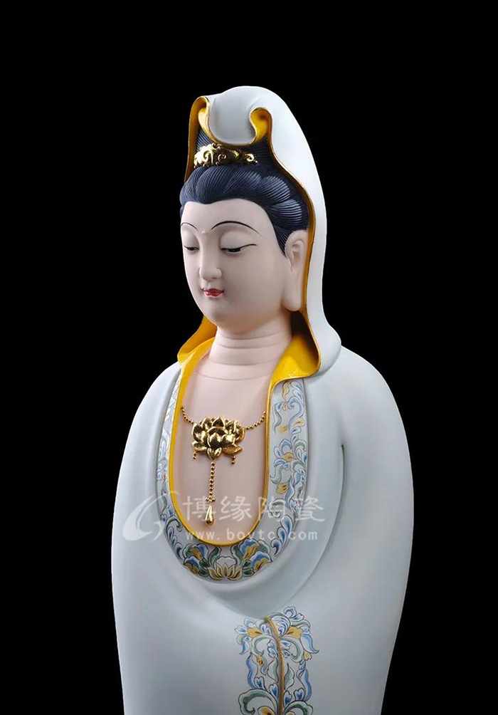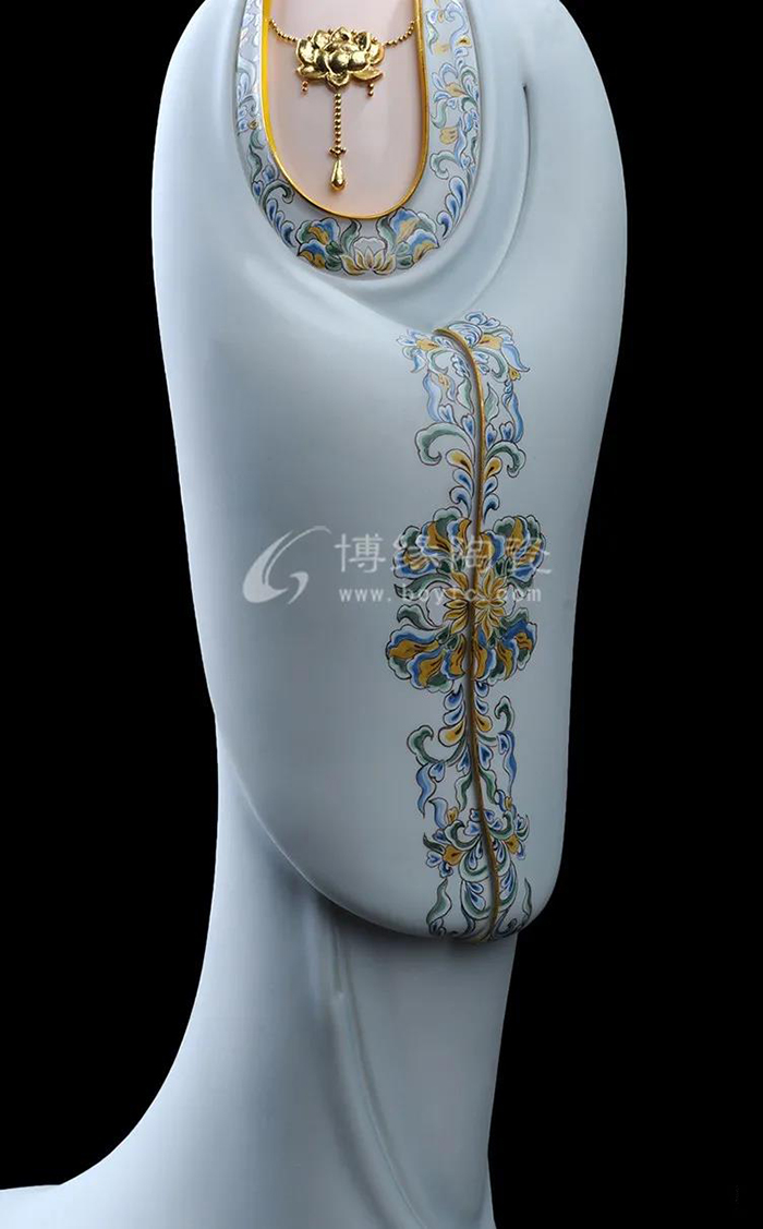 《瓷韻觀音》作品繼承德化“何派”傳統(tǒng)風(fēng)格加以創(chuàng)新,線條簡潔,類顯S型,作品造型優(yōu)美,觀音面部低首垂目、飽滿豐潤、神情慈祥,似在俯瞰塵世眾生。人物的珠串、花飾手工捏塑而成,細(xì)致逼真,作品以德化白瓷為胎體經(jīng)手工繪制,珠串、頭飾手工繪金,使作品更高貴。