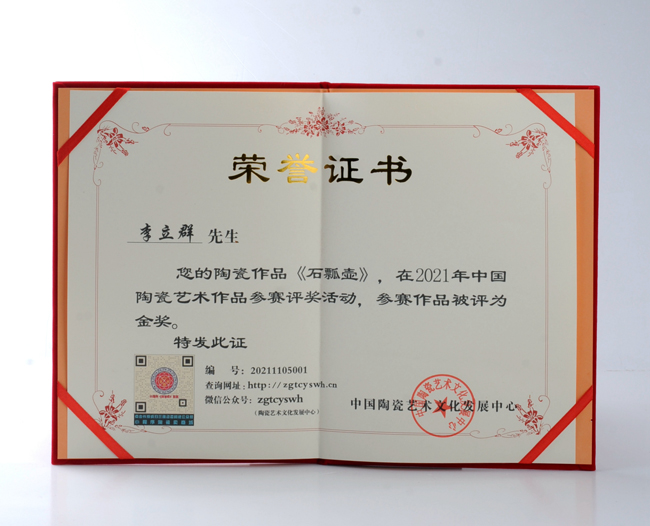 作品《石瓢壺》榮獲2021年中國陶瓷藝術作品評獎金獎