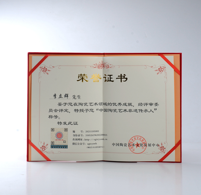 李立群,1963年出生于中國瓷 都福建德化,中國陶瓷藝術非遺傳 承人、福建省工藝美術師、優(yōu)秀創(chuàng) 作坊工作室、中國陶瓷藝術文化發(fā) 展中心會員,福建省德化縣金博瓷 廠總經理兼藝術總監(jiān)。