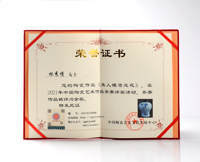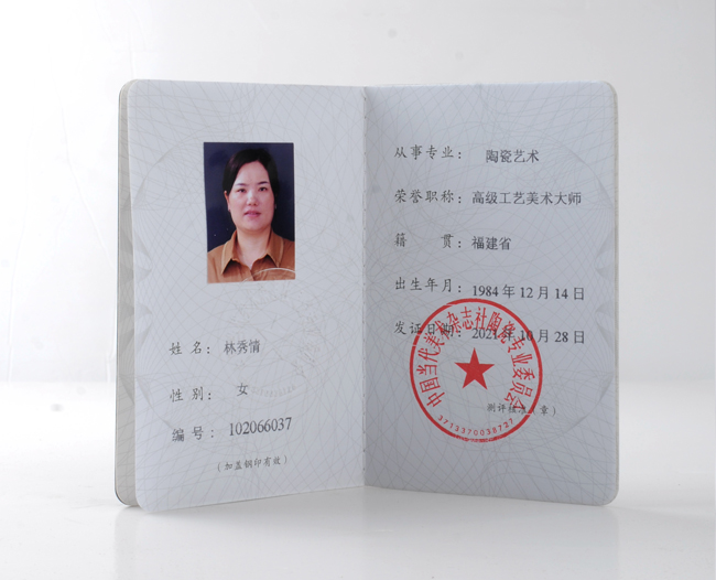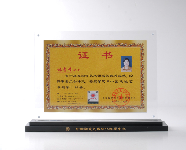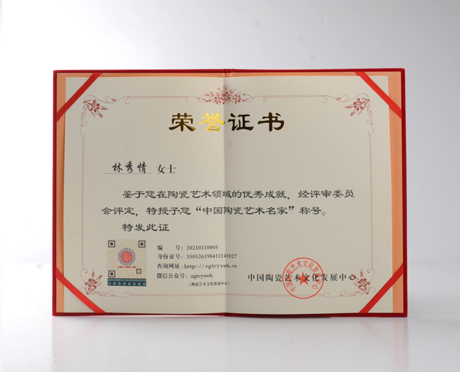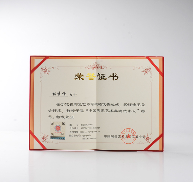 林秀情從小深受千年瓷都德化陶瓷文化熏陶,耳濡目染,便對德化陶瓷產生濃厚興趣,也喜歡上了陶瓷及其燒制技藝。畢業(yè)后便開始從事陶瓷創(chuàng)作,2005年起開始專注茶器設計生產,2013年成立福建德化興永達陶瓷有限公司并任兼藝術總監(jiān),經過10多年學習與工作積累,熟練掌握泥料選配、器型設計、手拉坯、手繪制作、燒制技藝等。其積極探索與大膽創(chuàng)新,將青瓷釉與德化白瓷結合,并將明清古典風與當代審美相結合,產生不一樣的視覺效果。經過多年創(chuàng)作,其創(chuàng)作出一系列青瓷茶器、茶葉罐等,作品器形豐富,款式新穎,深受廣大客戶喜愛,多件作品被評為金獎,作品《富貴蓋碗迎客松》、《美人罐鳶尾花》榮獲北京中國陶瓷藝術名家作品展金獎等。