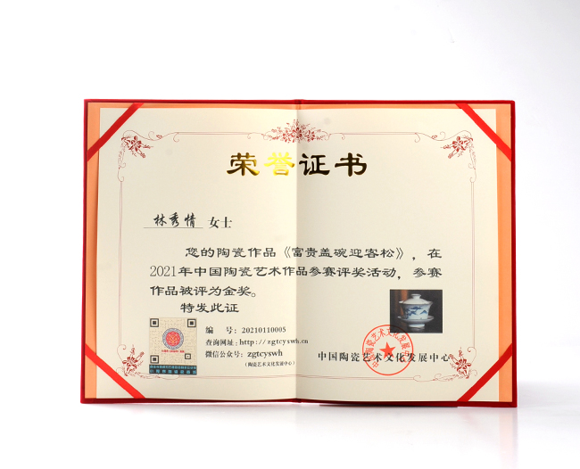 陶瓷藝術作品《富貴蓋碗迎客松》榮獲金獎