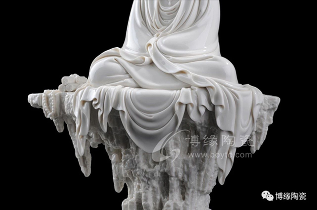 《觀自在》作品以德化白瓷為胎體,瓷質(zhì)溫潤細膩,以白瓷之純靜表現(xiàn)觀音之圣潔,觀音端坐在巖石之上,身旁置有佛珠及經(jīng)書,觀音頭梳高髻,雙目微下垂,似凝神靜思,雙手藏于袖,衣褶深刻 ,線條圓潤流暢,翻轉(zhuǎn)自然,容貌端莊、超凡脫俗、高貴典雅。