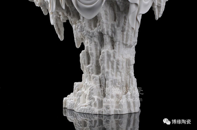 作品巖石雕刻精細且逼真,巖石凹凸奇兀,手法不落俗套,別具匠心,仿佛見觀音坐立于山巖之上普觀眾生,作品傳承明代“瓷圣何朝宗 ”的藝術(shù)手法及韻味,實屬一件難得佳作。