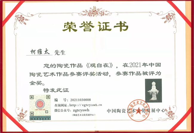 近日,中國青年陶瓷藝術(shù)家柯維太創(chuàng)作的作品《觀自在》在2021年中國北京陶瓷藝術(shù)名家作品展評比上被評為金獎。