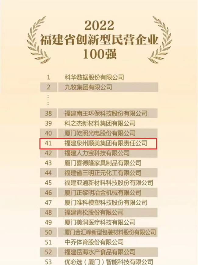 9月26日,福建省工商聯(lián)發(fā)布2022福建省民營企業(yè)100強、2022福建省制造業(yè)民營企業(yè)50強、2022福建省創(chuàng)新型民營企業(yè)100強三個榜單。順美集團榮列“2022福建省創(chuàng)新型民營企業(yè)100強”