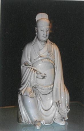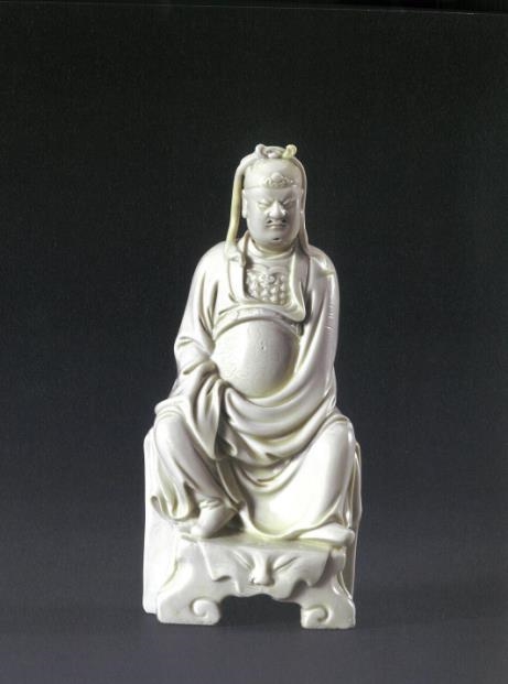 何朝宗留存于后世的作品寥若星辰,德化縣陶瓷博物館收藏的何朝宗瓷塑作品《文昌帝君》與《祥云觀音》即為其二。在“明代白瓷·獨樹一幟”展廳,鎮(zhèn)館之寶祥云觀音像,通體泛牙白色,線條清秀婉轉(zhuǎn),自如流暢;觀音頭披巾幔,腳踏祥云,面露慈悲,略略俯首,狀若普度世間眾生,令觀者心生敬愛。僅一尊觀音像,盡顯何朝宗的瓷塑功力。