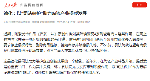 14日,人民日報客戶端刊發(fā)了《德化:以“司法保護”助力陶瓷產(chǎn)業(yè)提質(zhì)發(fā)展》報道。