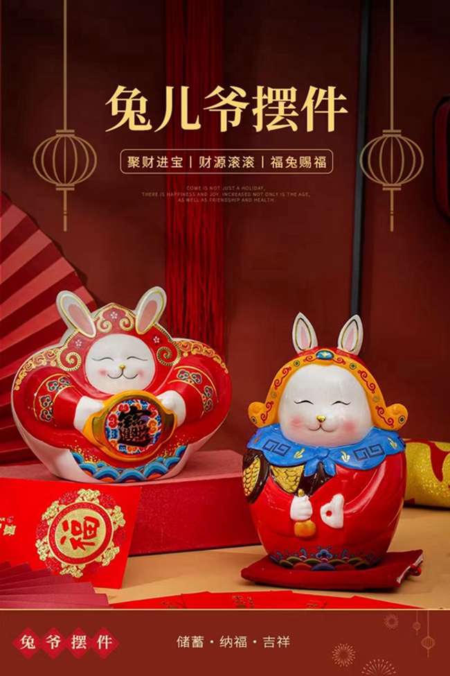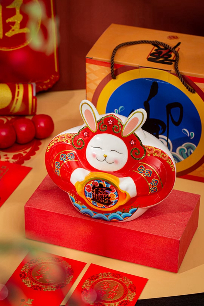 以“兔”、“春”作為主要設(shè)計(jì)元素,中國(guó)紅為主色調(diào),融入古風(fēng)、古典、喜慶等手繪裝飾,濃濃吉祥中國(guó)風(fēng),擺件從里到外滿滿都是亮點(diǎn)。俏皮可愛(ài)的兔子,頭頂如意,滿臉笑意,手捧金元寶,像喜樂(lè)融融的在喜迎接新春的到來(lái),整器設(shè)計(jì)、工藝細(xì)節(jié)滿滿呢!