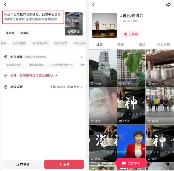 參賽者在規(guī)定活動時間內(nèi),將參賽作品上傳到自有抖音號,配文案 +#德化瓷博會#話題,并@“德化國際陶瓷博覽會”官方抖音號后發(fā)布即可參賽。