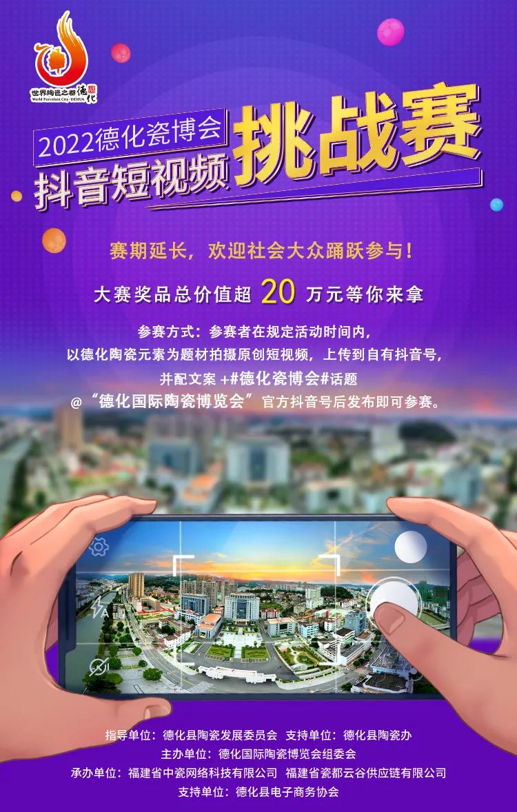 經(jīng)德化瓷博會組委會研究,決定將原定于2022年11月3日至5日在德化會展中心舉辦的2022德化國際陶瓷博覽會(以下簡稱“德化瓷博會”)延期,配套活動“2022德化瓷博會抖音短視頻挑戰(zhàn)賽”比賽時間也將繼續(xù)延長,創(chuàng)作時間更充裕,主辦方在此誠邀社會各界人士積極參與,助力打響“德化瓷博會”名片,不斷提升瓷都德化的社會影響力。