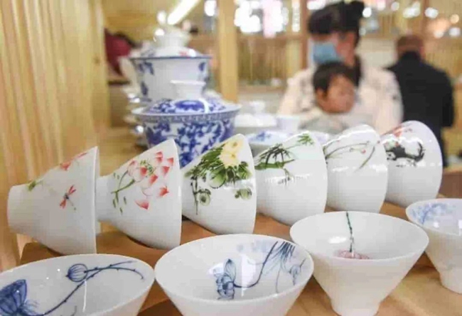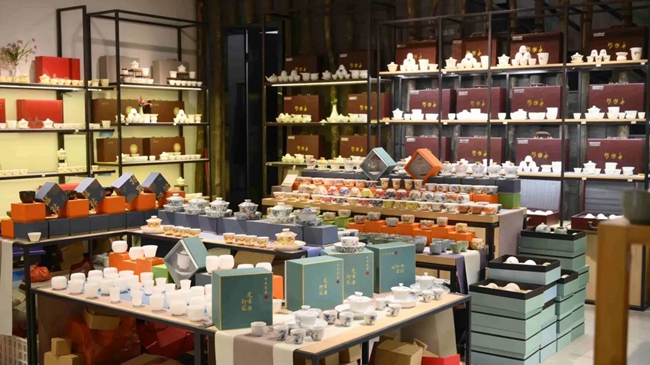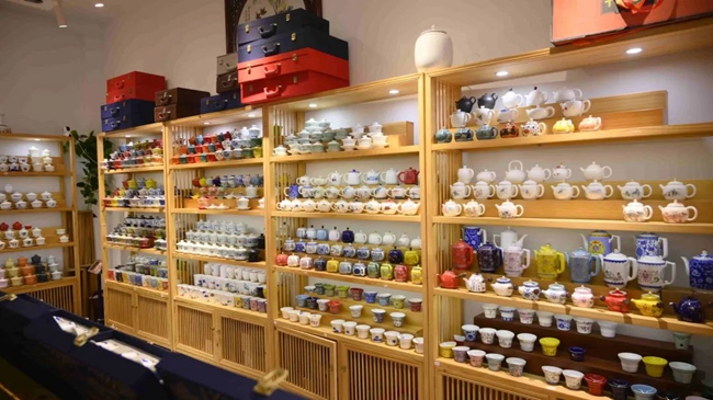 走進(jìn)中國茶具城,街道兩側(cè)排布著大大小小的茶具及配套產(chǎn)品企業(yè)展廳。走入一家,便可看到展架上琳瑯滿目的特色茶具,有配以四季花卉圖案的季節(jié)主題茶盞,有溫潤透亮、做工精美的白瓷茶杯,還有適用于贈(zèng)人、自用不同場(chǎng)景的套裝茶具。