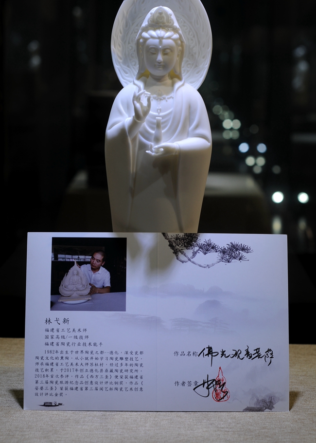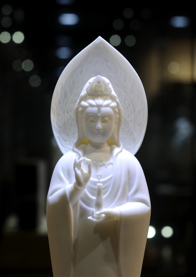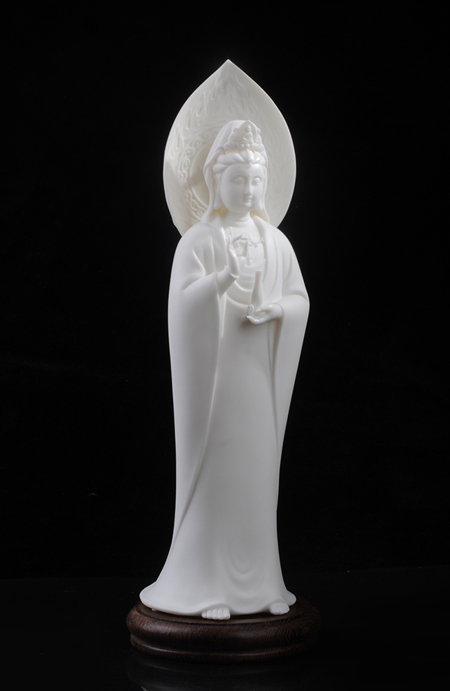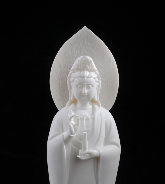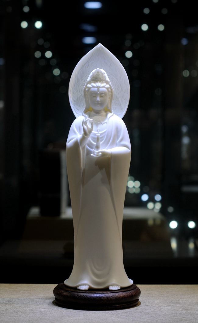 德化瓷器,以白瓷為最;白瓷之中,又以佛像為最。德化白瓷所塑佛像有性格鮮明、造型優(yōu)美、神態(tài)逼真、風(fēng)格洗練的特點(diǎn)。有一種單純的雕塑美和原材料的質(zhì)地美,最能體現(xiàn)佛教樸素、平和的思想。