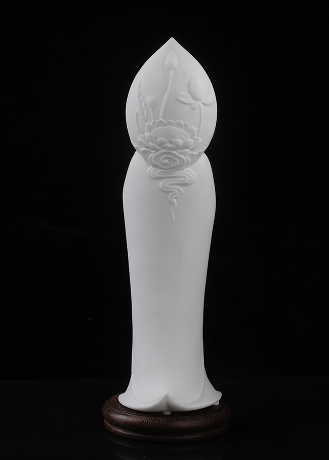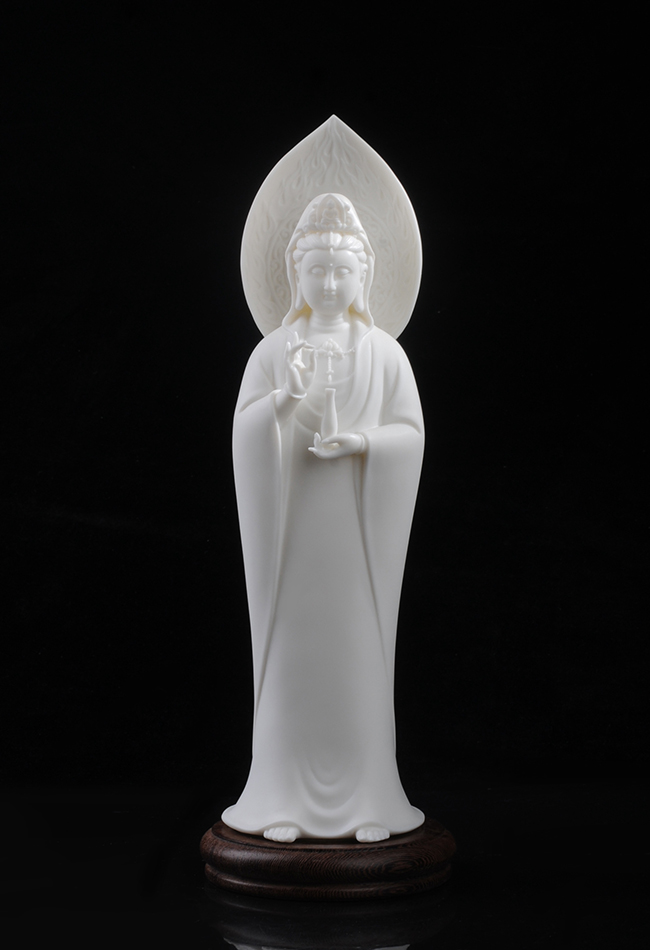 《佛光觀音》由國(guó)家高級(jí)/一級(jí)技師林弋新設(shè)計(jì)創(chuàng)作。作品以德化溫潤(rùn)如玉的 “中國(guó)白”為胎質(zhì),經(jīng)1300多度高溫?zé)疲ンw溫潤(rùn)如玉,瓷感細(xì)膩。本尊觀音面部表情十分靜謐安逸、端莊慈祥,臉形寬、額豐頤、雙目低垂、斂神凝思、笑意若隱若現(xiàn)。其精巧纖秀,工細(xì)逼真,造型生動(dòng),形象傳神,精雕巧塑,風(fēng)格獨(dú)特。作品底部落有大師印章落款,兼具審美價(jià)值和收藏價(jià)值,是不可多得的雅作。是辦公、家居、書房裝飾擺設(shè)、收藏的好選擇。