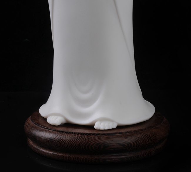 早在明代德化白瓷佛像就名聲在外,一代“瓷圣”何朝宗佛像名作流傳后世,成為世界各大博物館收藏的珍品,更對(duì)佛像雕塑史上產(chǎn)生深遠(yuǎn)的影響,形成“何派”雕塑,其開創(chuàng)的捏、塑、雕、刻、刮、削、接、貼八字技法延用至今。何派觀音雕塑注重于細(xì)節(jié)之美,精益求精,故而十分著意衣紋的刻畫,使線條流暢,翻轉(zhuǎn)自然。觀其佛像,仿佛有春風(fēng)拂面,衣袂飄揚(yáng)的出塵之感。