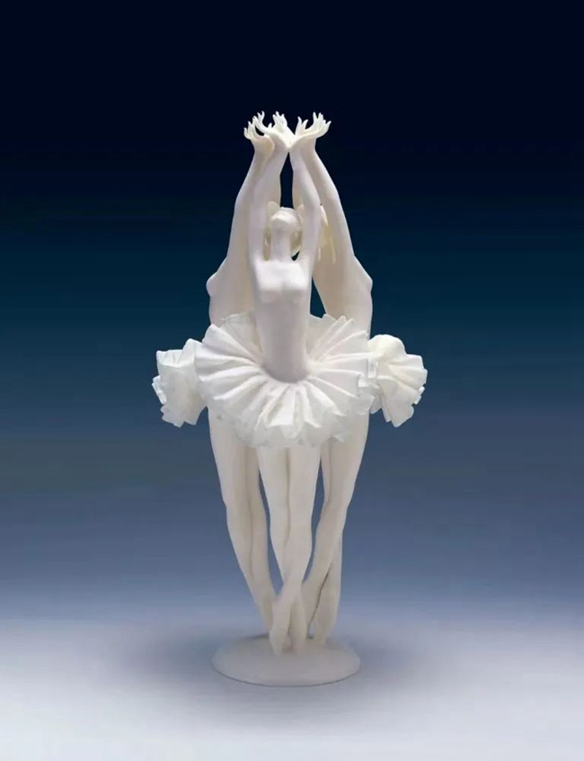 走進瓷藝城大師館,映入眼簾的便是中國工藝美術(shù)大師許興泰的白瓷作品《觀音頭像》,觀音頭梳發(fā)髻,經(jīng)過許興泰打磨的秀發(fā)紋理分明,細膩溫潤。另一處展柜呈現(xiàn)的《天鵝湖》由柯宏榮、陳桂玉共同創(chuàng)造,三位芭蕾少女踮起腳尖、高舉雙手,在渺渺樂曲中一展舞姿。邱雙炯制作的仕女持扇輕笑、神態(tài)嬌柔,她身著綾羅,瓷土燒制的裙擺皺褶如水波粼粼,仿佛當真由綢緞編織而成……諸位大師作品齊聚一堂,無聲交談中,盡顯德化陶瓷美學魅力。