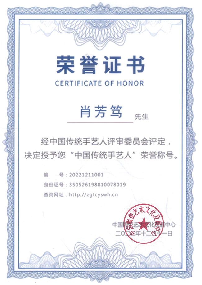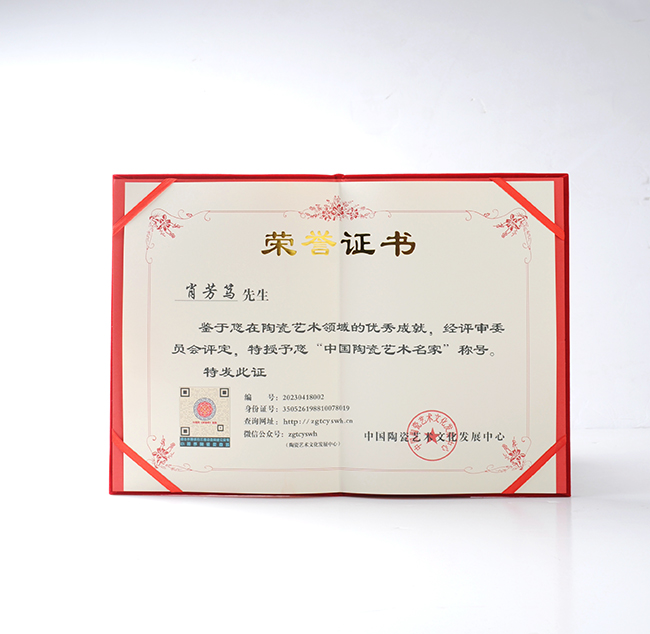 肖芳篤出生于“世界瓷都德化”,從小耳濡目染,便喜歡上陶瓷這門藝術(shù),2013年開始學(xué)習(xí)陶瓷制作,肖芳篤深入大師工作室,從點(diǎn)點(diǎn)滴滴學(xué)起。經(jīng)過近10年的拜師學(xué)藝,熟練掌握制瓷各個(gè)工序,如瓷泥加工、手拉胚、塑樣、燒制等無不樣樣精通。先后深入宜興等地學(xué)習(xí)交流制壺技藝。2021年成立德化瀚篤陶瓷有限公司,經(jīng)過多年積累,創(chuàng)作出一系優(yōu)秀茶器作品,主要作品有冰種玉瓷茶具套裝、主人杯、瓷壺、手繪茶器等,所創(chuàng)作品造型優(yōu)美、瓷質(zhì)溫潤如玉,作品曾多次獲各評比金獎(jiǎng),2022年《招財(cái)納!窐s獲北京陶瓷藝術(shù)名家作品展金獎(jiǎng),2023年《人生雅事》、《精雕禪定杯》榮獲北京陶瓷藝術(shù)名家作品展金獎(jiǎng),作品廣受客商、收藏愛好者喜愛。