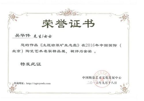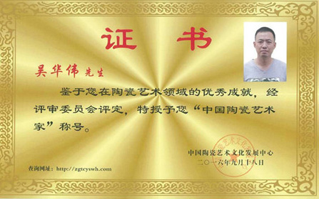 2016年經(jīng)中國(guó)陶瓷藝術(shù)文化發(fā)展中心評(píng)審委員會(huì)評(píng)定為“中國(guó)陶瓷藝術(shù)家”。
