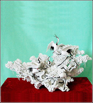夸張簡(jiǎn)潔,神態(tài)悠揚(yáng),色澤明朗,既有傳統(tǒng)瓷雕的吉祥寓意,又有時(shí)代趣味。