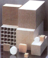 蜂窩陶瓷填料,是一種多孔性的新型工業(yè)用陶瓷材料,其內(nèi)部結(jié)構(gòu)是許多蜂窩狀平行通道,這些蜂窩通道為正方形小管,壁厚0.7mm,比表面積可達(dá)850-1100m2/m3 ,是瓷矩鞍環(huán)、瓷波紋填料及其他塊狀陶瓷的十倍以上,而對(duì)流體造成的壓力損失僅為上述填料的1/3-1/10,它具有很低的熱膨脹系為九、耐腐蝕性強(qiáng)、重量輕、強(qiáng)度高。因此,本產(chǎn)品具有極廣泛的用途。如有作汽油車排氣催化轉(zhuǎn)化器的載體、柴油機(jī)煙塵的凈化器、臭氧抑制催化劑載體、冶金工業(yè)用作熱交換器及金屬液過(guò)濾器、化學(xué)工業(yè)的化學(xué)反應(yīng)載體及催化劑、采礦業(yè)用來(lái)凈化處理有毒氣體和液體、輕工業(yè)的噴涂及建材工業(yè)的消聲材料、窯爐的除煙除塵、隔熱材料、石化行業(yè)用于過(guò)濾器脫色提純,科研單位用來(lái)作整流器、人民生活用炊具節(jié)能裝置等,主要出口西歐和東南亞國(guó)家。陶瓷填料具有優(yōu)異的耐酸耐熱性能,能耐除氫氟酸以外的各種無(wú)機(jī)酸、有機(jī)酸及有機(jī)溶劑的腐蝕,適用于各種高、低溫及強(qiáng)度腐蝕性的場(chǎng)合?捎糜诨、冶金、煤氣、制氧等行業(yè)的干燥塔、吸收塔、冷卻塔、 洗滌塔、再生塔等。 |