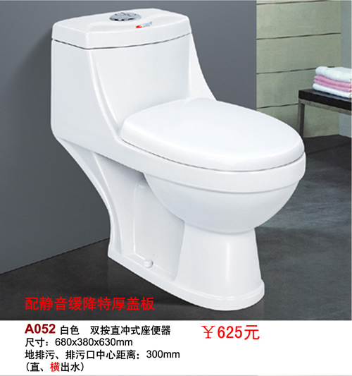 A052 白色 雙按直沖式座便器 ¥625元 尺寸:680*380*630mm 地排污、排污口中心距離:300mm(直、橫出水) |