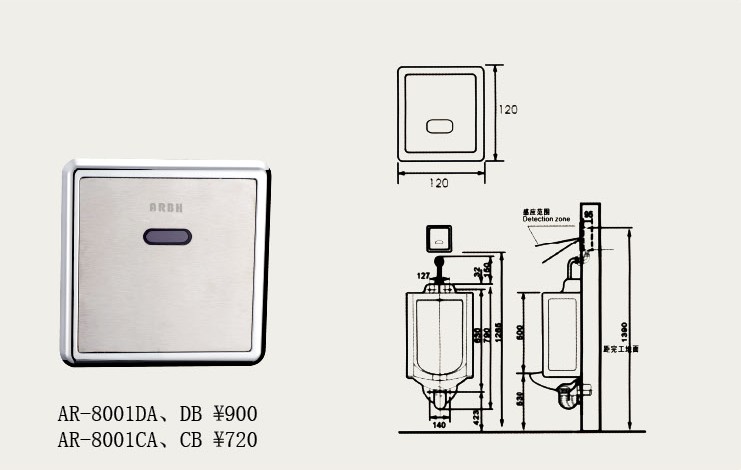產(chǎn)品參數(shù)表: 電源:DC6V(4節(jié)5號(hào)堿性電池) 靜耗:≤0.5W(DC) 沖水時(shí)間:感應(yīng)后沖水2秒,離開時(shí)再?zèng)_4秒 感應(yīng)范圍:自動(dòng)測(cè)距 進(jìn)出水管徑:G(1/2)″(DN15) 感應(yīng)確認(rèn)時(shí)間:2秒(不足2秒不啟動(dòng)) 適用環(huán)境溫度:1-55℃ 流量:≥0.12(L/S) 防護(hù)等級(jí):IP56 功能特性: 1、紅外感應(yīng)、自動(dòng)關(guān)水出水、節(jié)水、方便、衛(wèi)生、可有效避免細(xì)菌交叉感染。 2、主機(jī)采用微電腦控制,可根據(jù)使用的頻率及每次使用的時(shí)間長(zhǎng)短自動(dòng)調(diào)節(jié)沖水時(shí)間,更有效節(jié)水。 3、機(jī)器在使用頻率高的場(chǎng)所平均每次的沖水量為1.2-3L,在使用頻率低的場(chǎng)所每次沖水量為2-4L(注水壓為0.3-0.6Mpa)。 4、內(nèi)設(shè)水量調(diào)節(jié)閥及過(guò)濾網(wǎng),非專業(yè)人員可以進(jìn)行水量調(diào)節(jié)及過(guò)濾網(wǎng)清洗。 5、當(dāng)便器長(zhǎng)期處于不使用狀態(tài),沖水器將24小時(shí)自動(dòng)沖水一次,以防存水彎中存水干涸,導(dǎo)致臭氣回竄。 6、藏墻體式設(shè)計(jì),體現(xiàn)裝飾與環(huán)境一體化。 7、機(jī)器可選擇交、直流兩種供電方式。 |